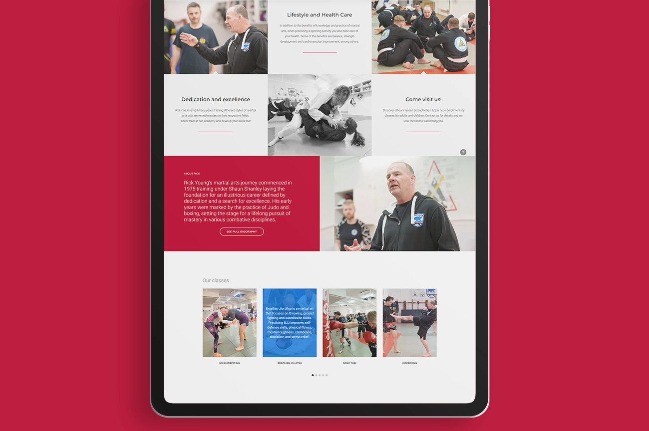 Situada em Edimburgo, Escócia, a academia é referência em artes marciais, principalmente quando se trata de Jiu-Jitsu. O cliente precisava atualizar o logo de uma forma que não perdesse a essência do anterior. Já o site basicamente consistiu em uma apresentação de toda a biografia do Rick e transformá-lo em um braço comercial para que pudessem trabalhar as questões de marketing digital.